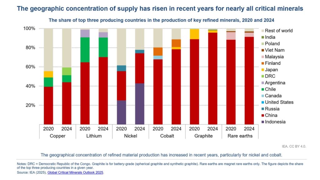 En 2024, la inversión global en minerales críticos fuera de los productores tradicionales mostró cierta desaceleración. Al mismo tiempo, las compañías chinas fortalecieron su integración en toda la cadena y aumentaron su market share. El mensaje es claro: quienes controlan el acceso, transformación y exportación de estos insumos definirán buena parte del ritmo y dirección de la transición energética.